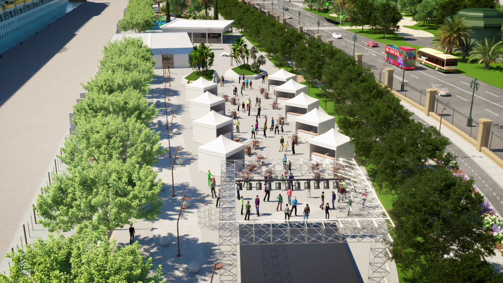 Al inicio de este paseo, junto a la nueva plaza creada en el extremo del Muelle Ciudad próximo a la Plaza de Sevilla, se contempla la implantación de un módulo de hostelería con terraza exterior que sirva como dinamizador de la zona y que deberá respetar las condiciones establecidas en la normativa urbanística aplicable.