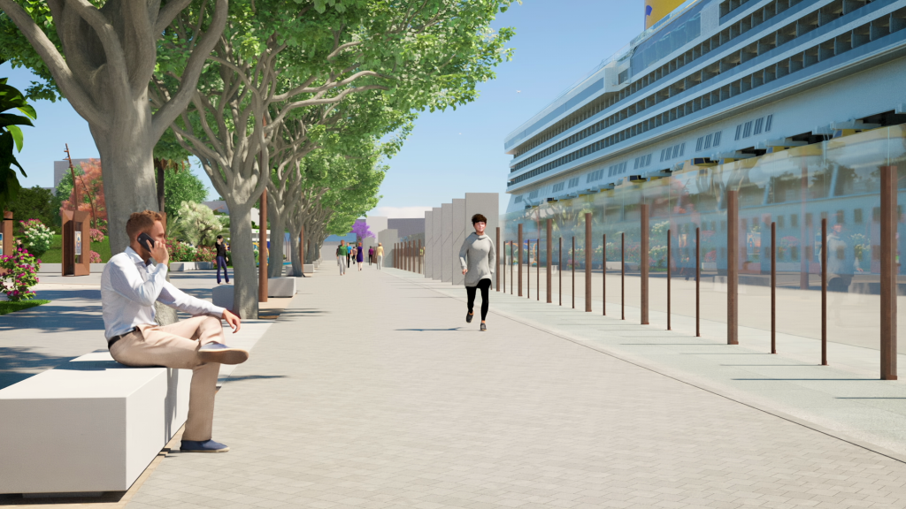 La vegetación, que se encuentra presente en todo el recorrido creando zonas de estancia, contribuye también a disminuir la dureza del paisaje portuario y transformarlo en un lugar más amable, al mismo tiempo que permite a los usuarios resguardarse del sol en los meses de fuerte calor. Las especies propuestas ponen de relieve la conexión de la ciudad con Hispanoamérica a través del puerto, además de resultar adecuadas a las condiciones climatológicas del lugar.