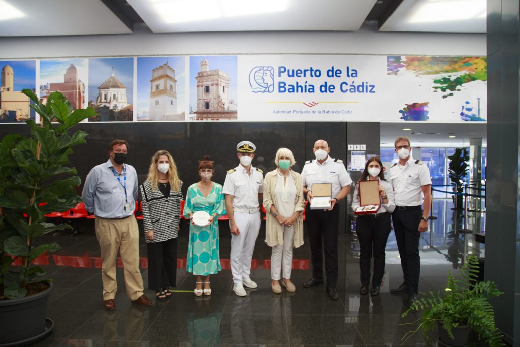 La presidenta de la Autoridad Portuaria de la Bahía de Cádiz, Teófila Martínez, acompañada de la delegada del Gobierno de la Junta de Andalucía en la provincia de Cádiz, Ana Mestre, y de la concejala de Comercio y Turismo del Ayuntamiento de Cádiz, Montemayor Mures, ha supervisado la operativa de embarque y desembarque de pasajeros y entregado una metopa conmemorativa al capitán del buque.