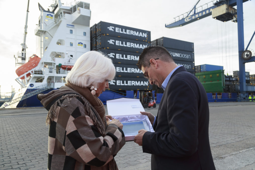 La presidenta entrega al director comercial de la compañía, Ellerman City Liners,una metopa conmemorativa por la primera escala