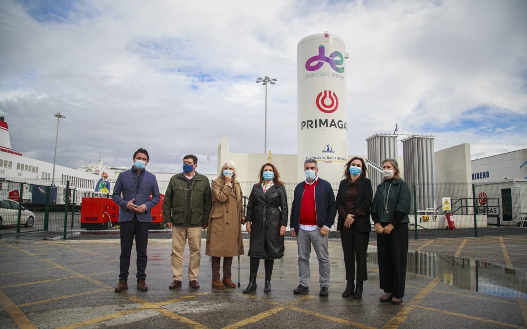 Cádiz, 27 de noviembre de 2020.- El Puerto de Cádiz, Divergent Energy y Primagas (filial de SHV Energy) se han aliado para llevar a cabo una solución energética pionera en el sistema portuario español y que representará un notable avance en la reducción de la huella de carbono de estas instalaciones. Se trata de un proyecto que genera electricidad a partir de un combustible bajo en carbono como el gas natural licuado (GNL) en las instalaciones del Puerto de la Bahía de Cádiz, concretamente para los camiones refrigerados que permanecen en el Muelle Marqués de Comillas de la dársena comercial mientras esperan el tránsito a otros puertos.