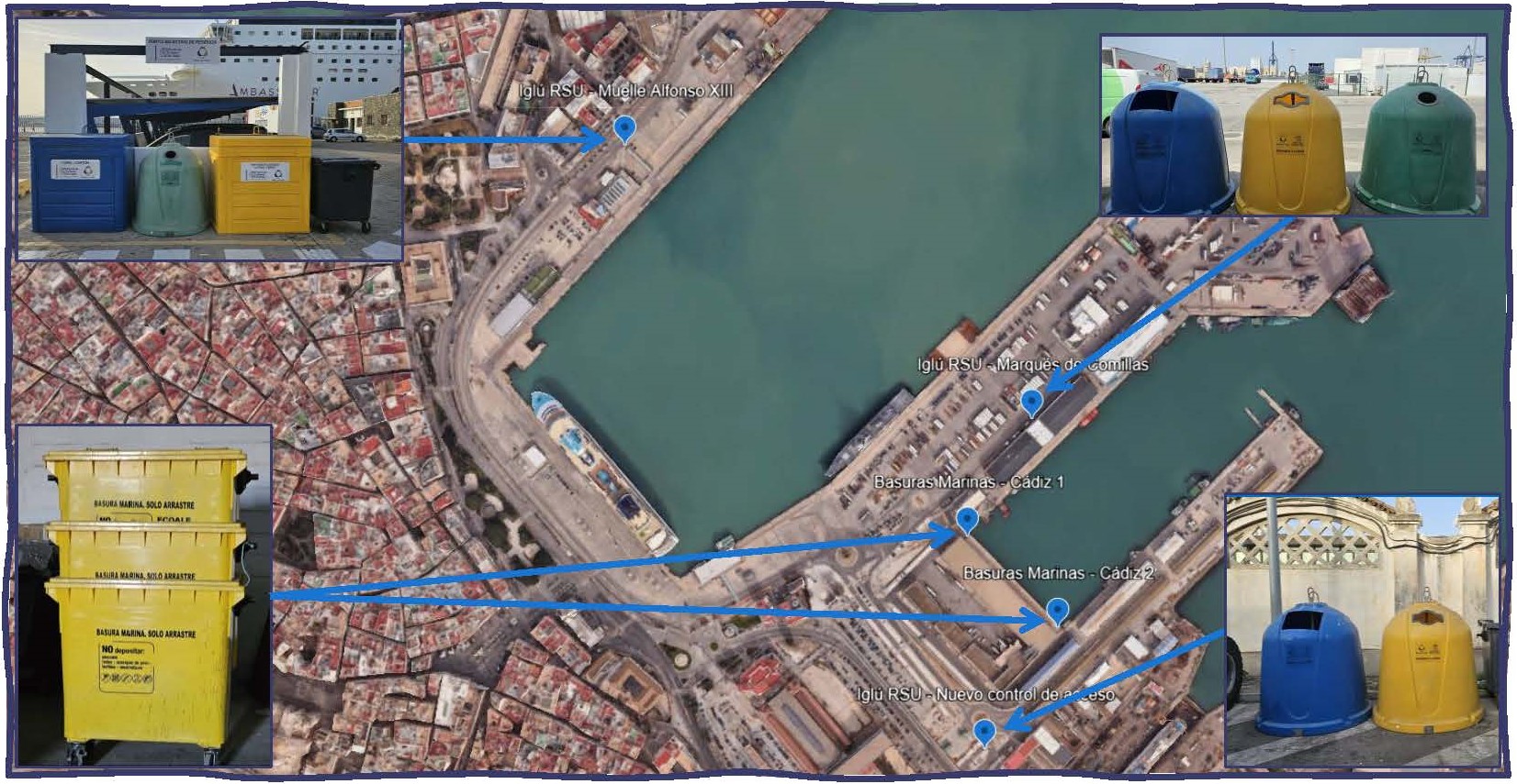 En las instalaciones portuarias de Cádiz podemos encontrar tres puntos de recogida selectiva de residuos no peligrosos que se encuentran en el muelle Fernández Ladreda, en el muelle Marqués de Comillas y en el nuevo control de acceso. También se encuentran dos puntos de recogida de basuras marinas en la dársena pesquera. Además, se prevé la construcción de un nuevo punto de recogida y almacenamiento de corcho blanco (POREXPAN).