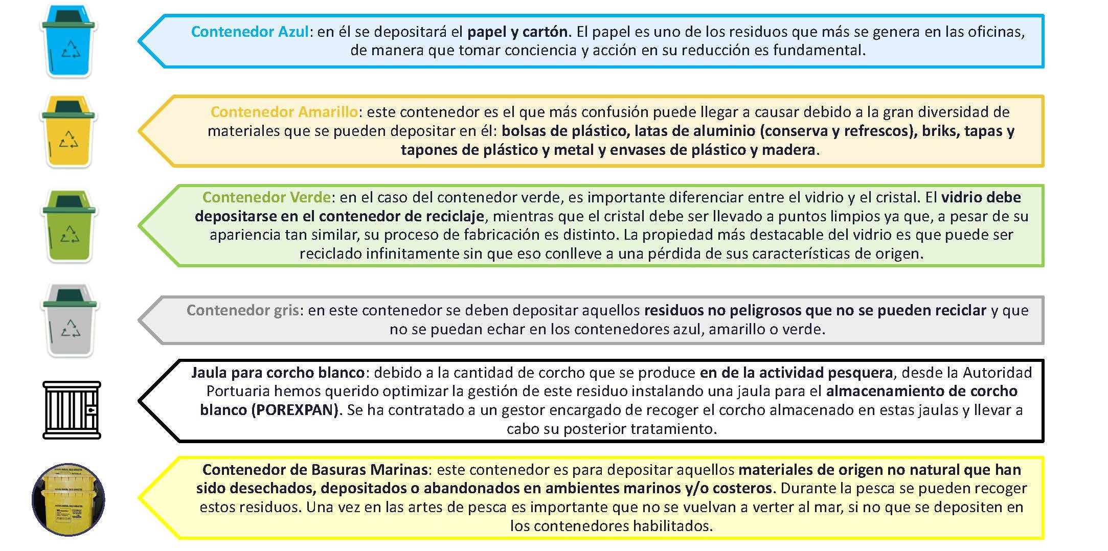 En el puerto se cuenta con los siguientes contenedores para albergar los distintos tipos de residuos que se generan: