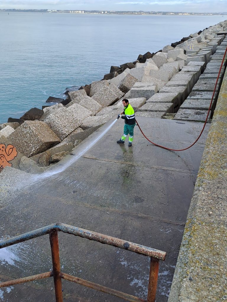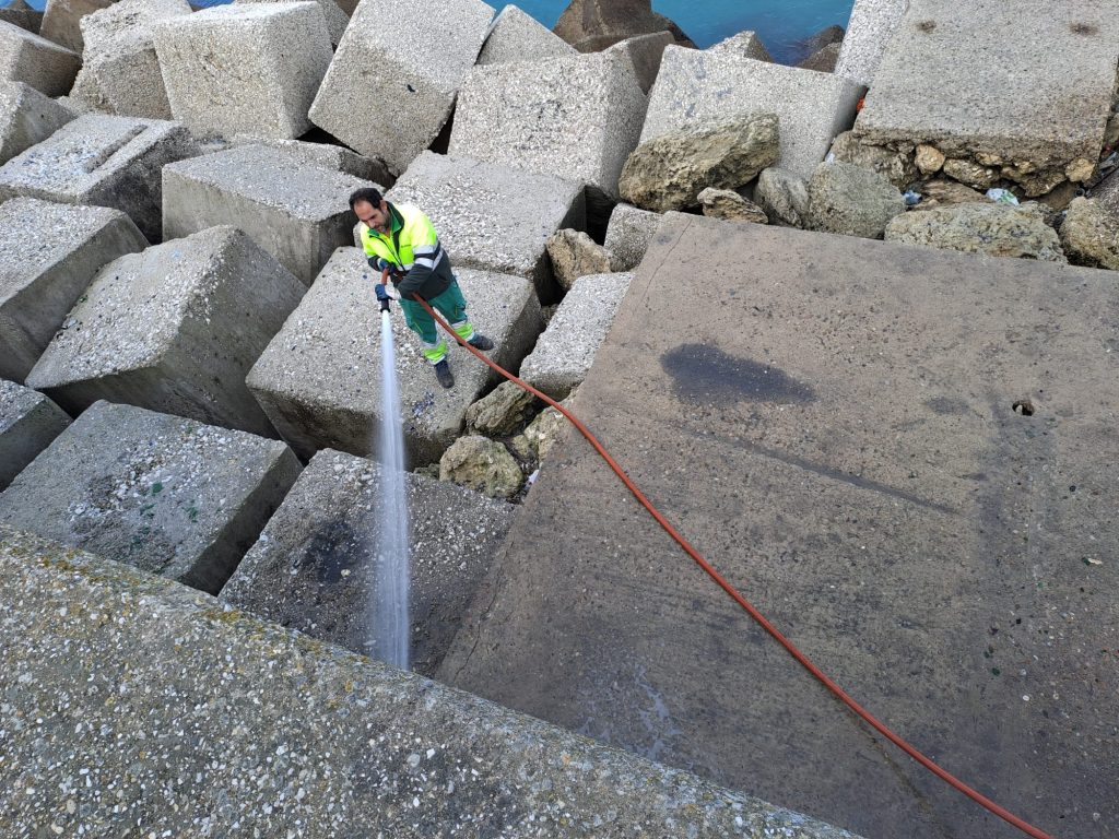 Jueves, 15 de enero de 2025. La Autoridad Portuaria de la Bahía de Cádiz ha llevado a cabo durante la pasada semana una actuación de limpieza, retirada de residuos y posterior baldeo y desinfección en las escolleras, escaleras y plataformas de la Punta San Felipe, Avenida Pascual Pery.