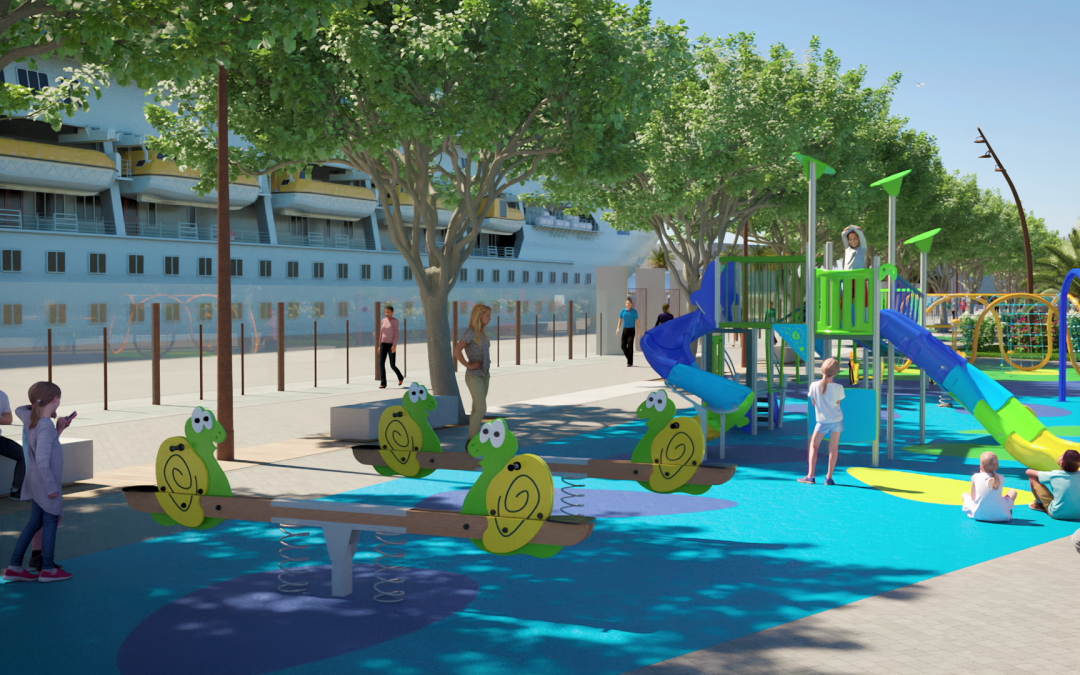 Entre las islas verdes centrales y el cerramiento que delimita la Zona de Maniobras portuarias se situará un parque infantil discontinuo destinado al juego de los más pequeños.