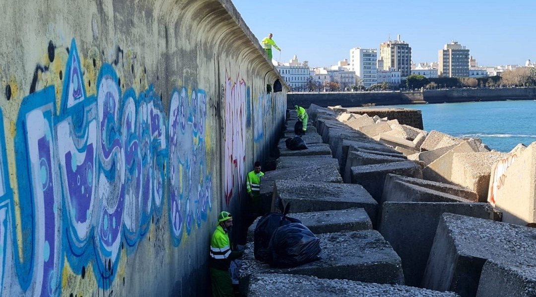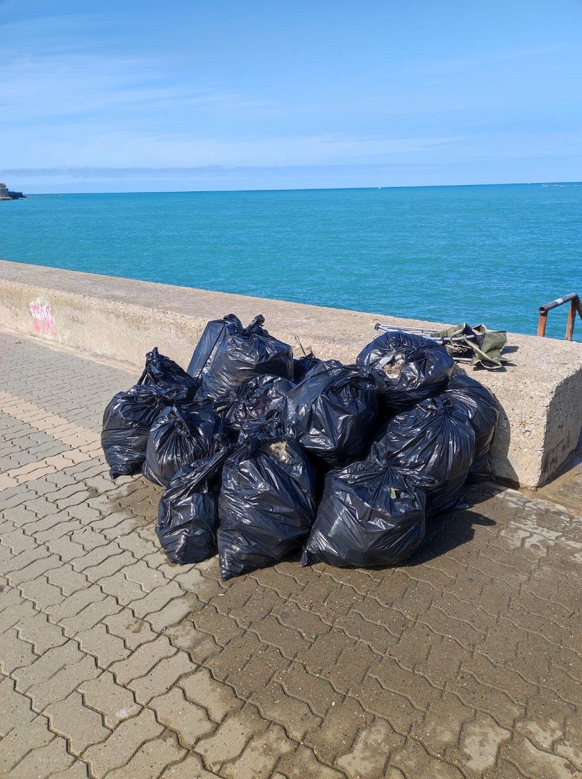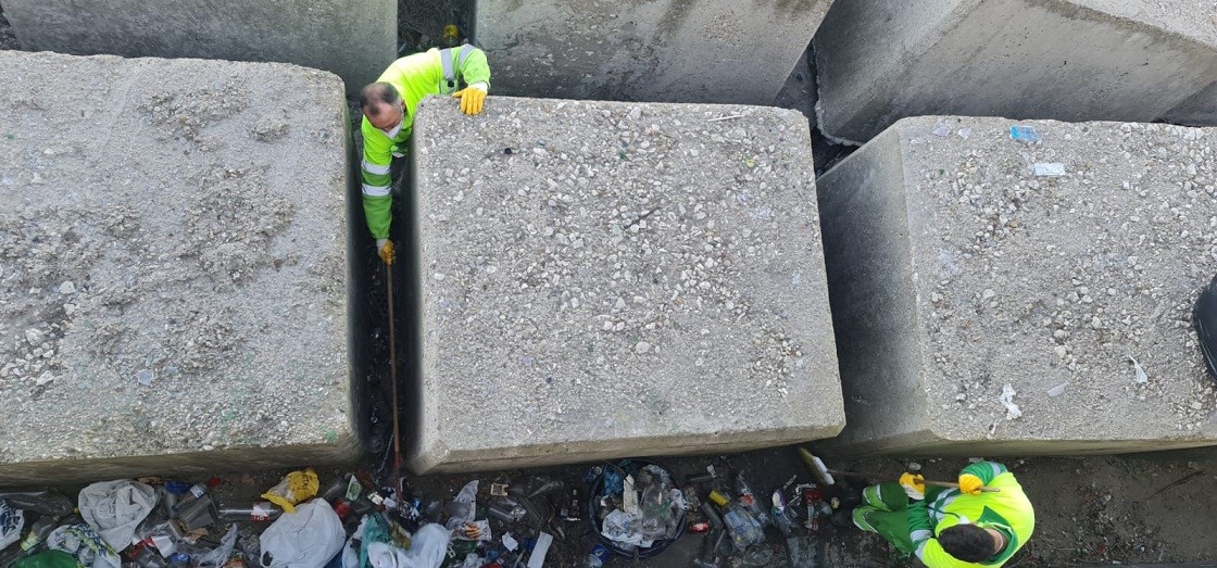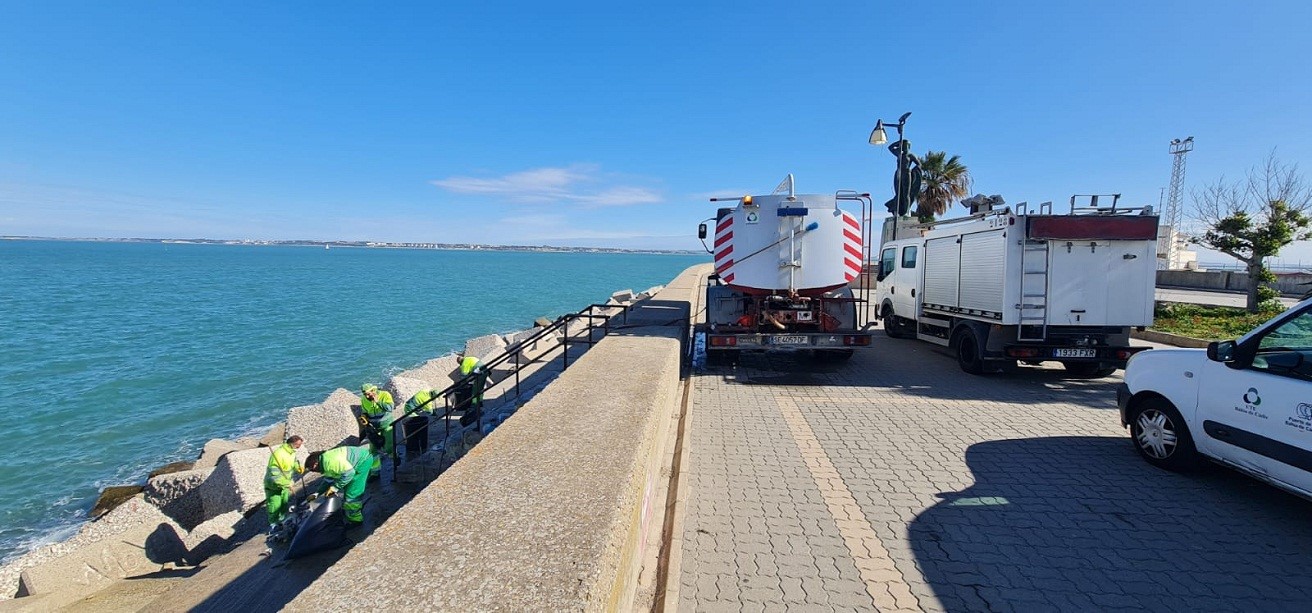 En total, se han recogido 113 bolsas de basura de tamaño grande y se ha procedido también al baldeo mecanizado con camión cisterna y aplicación de productos desinfectantes en todas las plataformas y escaleras en estas escolleras.
