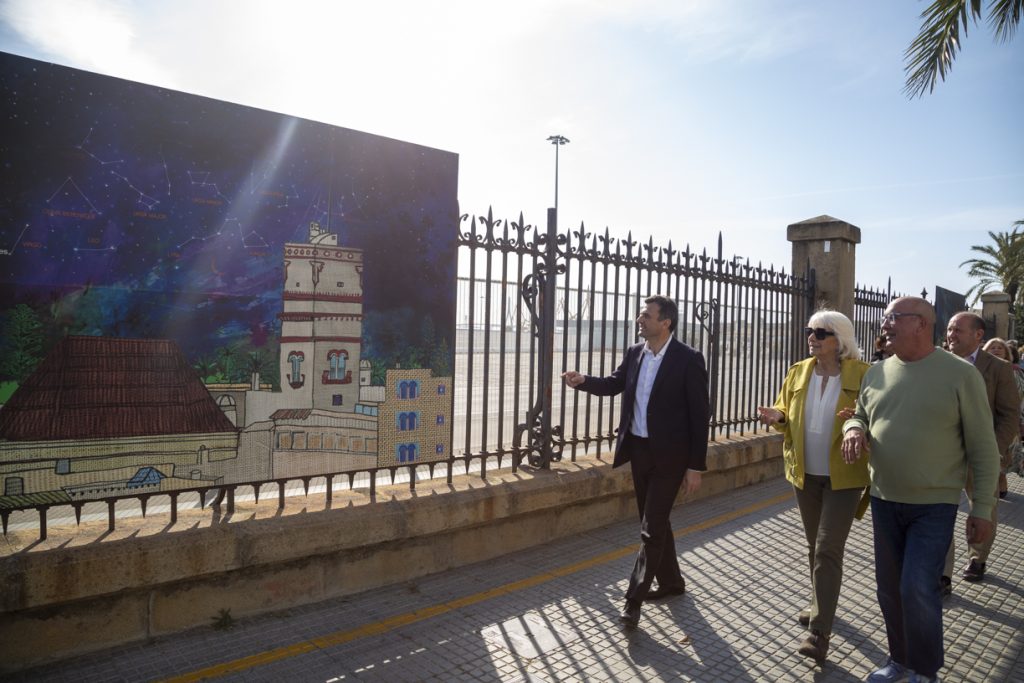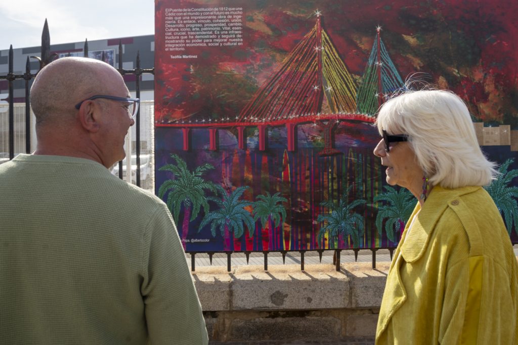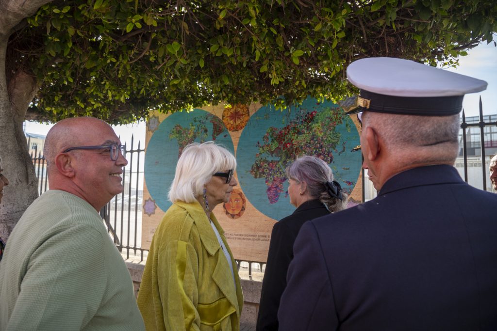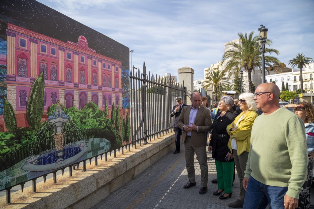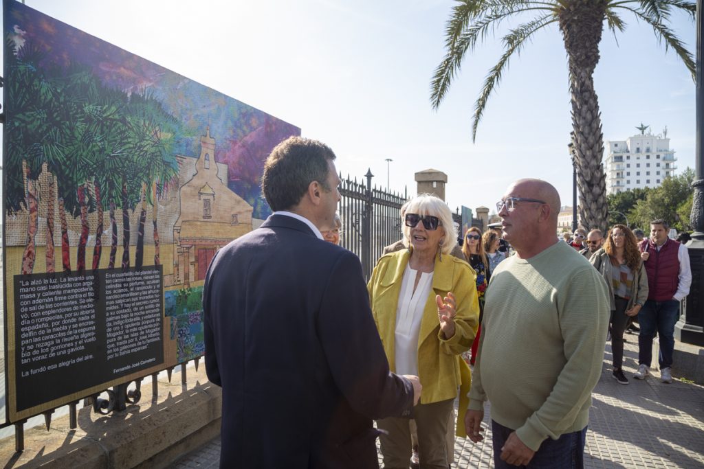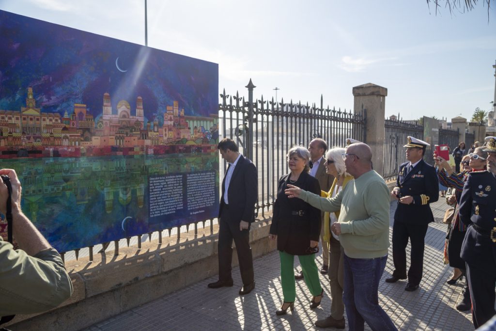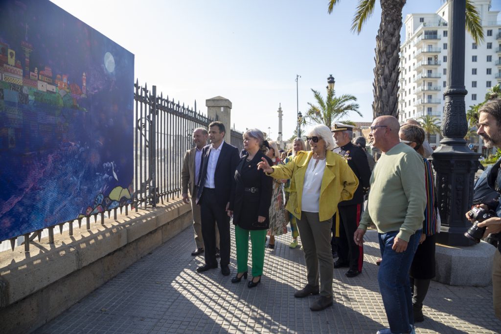 Lunes, 22 de abril de 2024. La presidenta de la Autoridad Portuaria de la Bahía de Cádiz, Teófila Martínez, y el alcalde de la ciudad, Bruno García, han inaugurado hoy la exposición Las Islas Soñadas, del pintor gaditano José Alberto López, instalada sobre la verja del muelle.